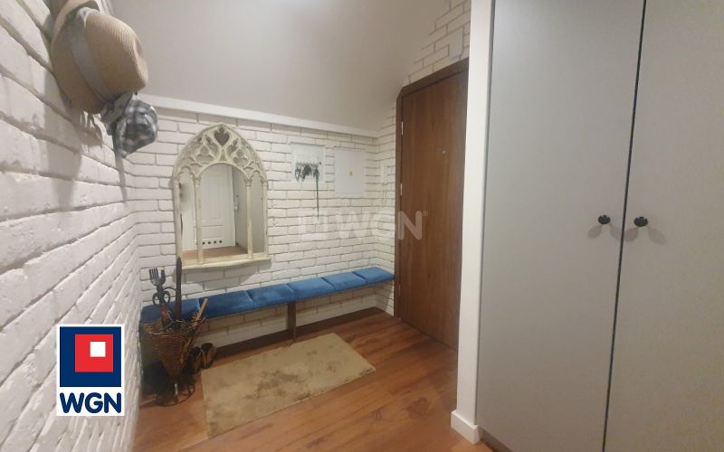 Już od wejścia uwagę przyciąga przemyślana aranżacja wnętrza. Po prawej stronie przedpokoju znajduje się wygodna ławka, idealna do komfortowego zakładania butów, a po lewej - rozciąga się pojemna, zabudowana szafa na okrycia wierzchnie. Ścianę przedpokoju zdobi prawdziwa, odkryta cegła pomalowana na biało, nadająca wnętrzu jasny, loftowy charakter i prowadząca do pozostałej części mieszkania.